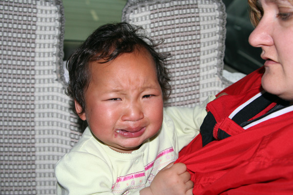 Today started out early with what was to become a very long day. We met the other family for breakfast at 7:30 AM. Then we were in the van at 8:30 to finalize the adoption at the Civil Affairs office. While we were waiting for the adoption decree paperwork, Annie actually slid off Alaina's lap to briefly play with a toy. This is the first time she got down from her lap on her own accord. After about 20 minutes, we received her adoption decree and certificate. Dang Li Jie is officially ours!