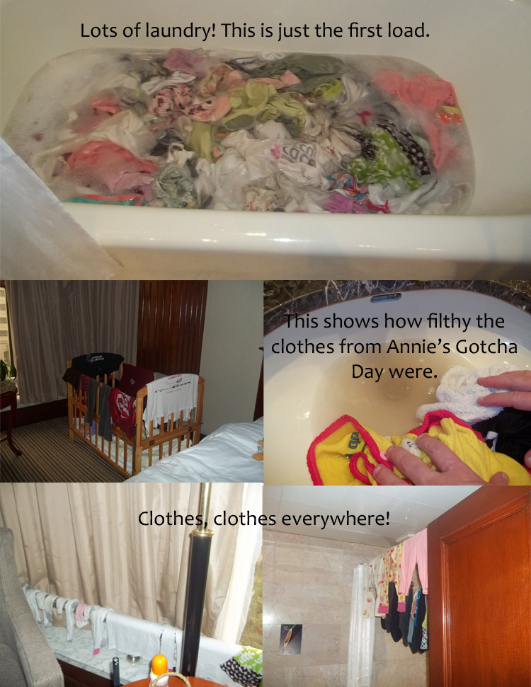 She slept for 3 hours this afternoon before we finally woke her up. During this time, Dayna and her Daddy worked on her Bible Study lesson and some journaling. Alaina discovered the joy of doing laundry in a hotel bathtub. She was incredibly thankful for Dan's help with the second "load.". We have utilized every possible space for hanging clothes. We figure it will probably take about 2 days for everything to dry.