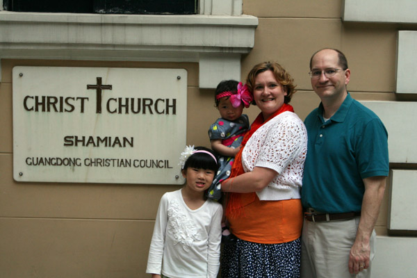 After breakfast, the three families here with our agency caught cabs to Shamian Island. This is the little oasis where the White Swan Hotel is located. Until a few years ago, almost all adoptive families from the US stayed at the White Swan. When we were here with Dayna, we lived on this little island for a week. Right now, the White Swan is under complete renovation, and the island looks a lot different.