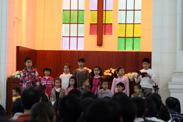 Annie made it through the first part of the service, which mostly involved singing. As guests, we were all given a copy of the Gospel of John in Chinese and English. Annie's first Bible! (We grabbed an extra copy for Dayna.) It was wonderful to watch the Sunday School children lead the congregation in a Chinese worship song. We were also able to sing "Because He Lives." Once the sermon started, however, Annie was done. Unlike our last visit, where there were so many newly adopted babies, this time fussy babies were not quite as welcomed. So Alaina and Annie slipped out into the courtyard and listened to the sermon over the speakers. The message was on 1 Corinthians 15 and the reality of the Resurrection.